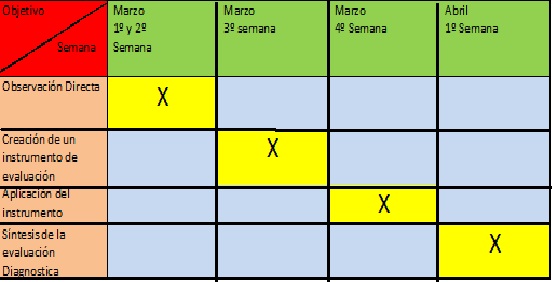 La carta Gantt expuesta en la presente página Web, corresponde a laa realización de la parte diagnostica de una Plan de intervención que se realizará en la Escuela FNº 732 de Chorombo Alto, en la cual se muestra de manera grafica el tiempo que se dedicara para cada una de las partes en la detección del Diagnóstico de este Centro de Parctica Profesional. La carta Gantt es un método de organzación de los ejes priciples que nos debemos enfocar y los tiempo que necesitaremos para su ejecución.